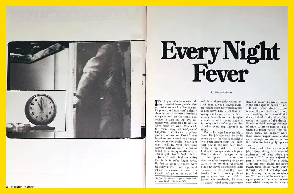 In this episode, we talk about “Every Night Fever,” a 1978 cultural trend story in Christopher Street about gays being addicted to going out. Written by then-23-year-old Michael Musto, who would go on to become a columnist for the Village Voice and a notable NYC nightlife personality, it gives voice to gay New Yorkers on both sides of Holleran’s imagined dichotomy: