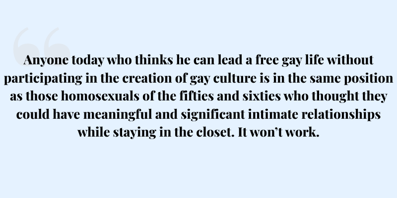 Anyone today who thinks he can lead a free gay life without participating in the creation of gay culture is in the same position as those homosexuals of the fifties and sixties who thought they could have meaningful and significant intimate relationships while staying in the closet. It won’t work. It didn’t work then. Untold numbers of homosexuals were severely damaged or driven to distraction by this contradiction beatween their intimate and their public lives—a situation brilliantly captured by The Boys in the Band, an analysis of an emotional pre-revolutionary situation if I’ve ever seen one. The only way to consolidate the gains of the past decade of gay liberation is to forge a new imagination of our lives and the world, and this can only be done by a serious interaction with our writers and artists, for these after all are the people who have elected the task of reporting and imagining and celebrating and criticizing how we live now.